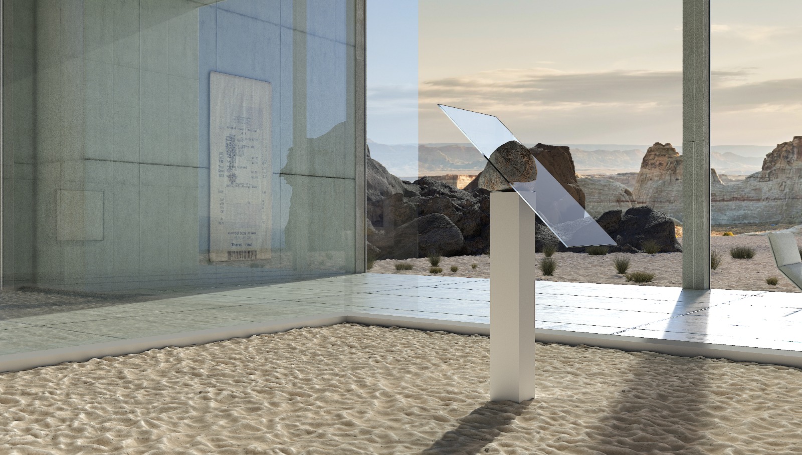 Lastly, in the middle of the Utah desert, a vast, contemporary looking museum resides, where a Brent Wadden hand-woven tapestry on canvas sits alongside the sophisticated design of a Pierre Paulin Tapis Siège, an Alabaster painting by Sterling Ruby and a stone and marble sculpture by Alicja Kwade.