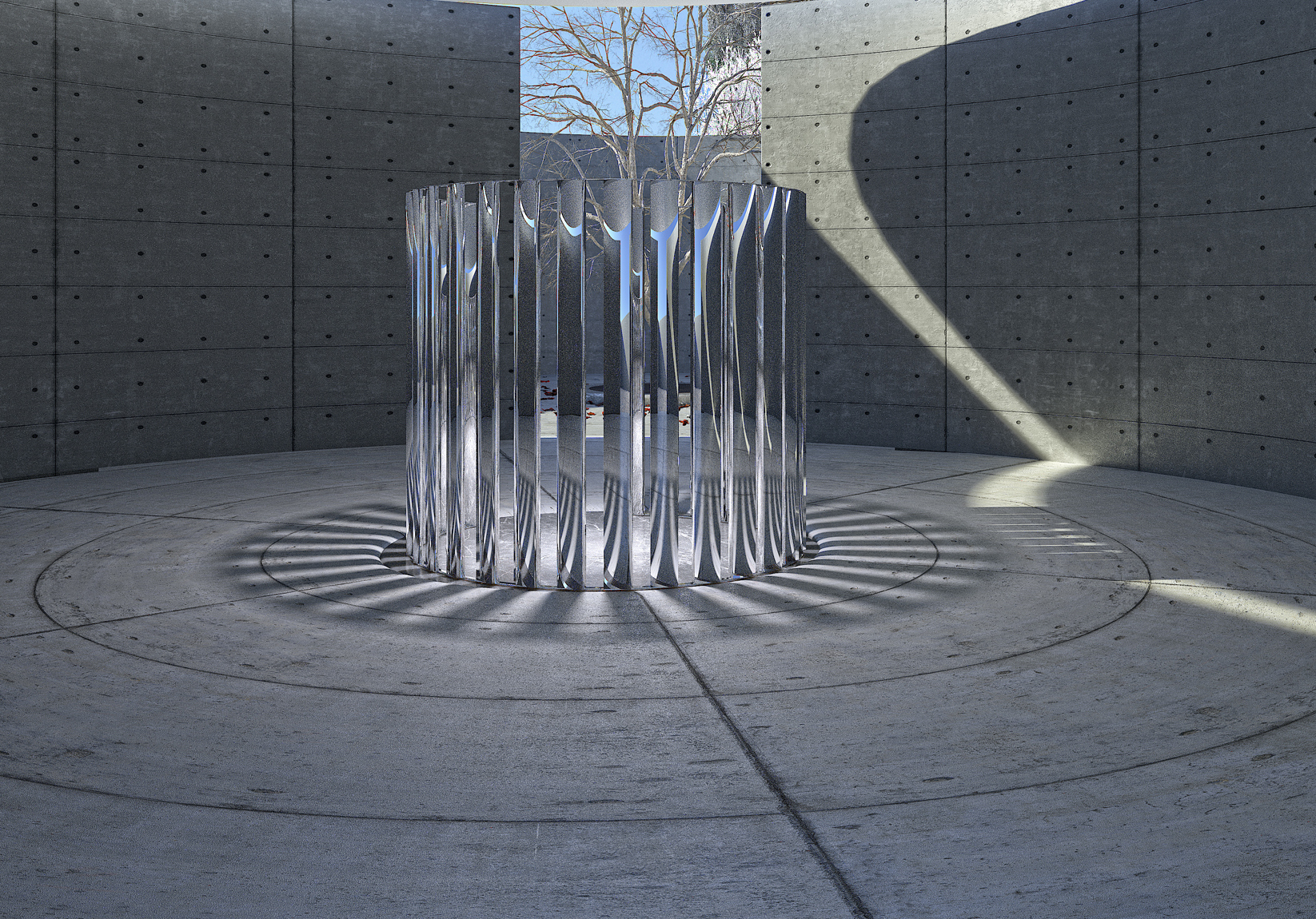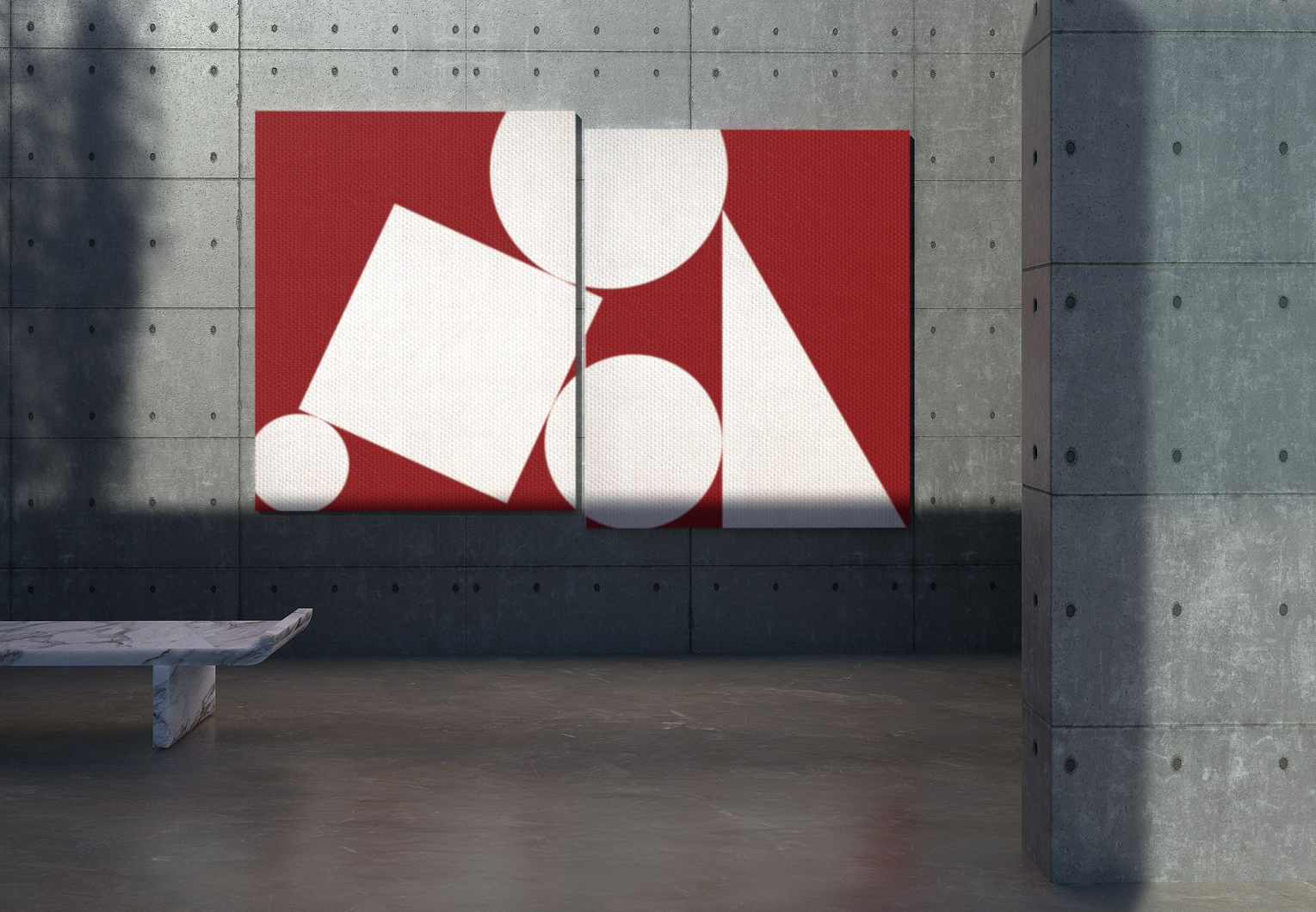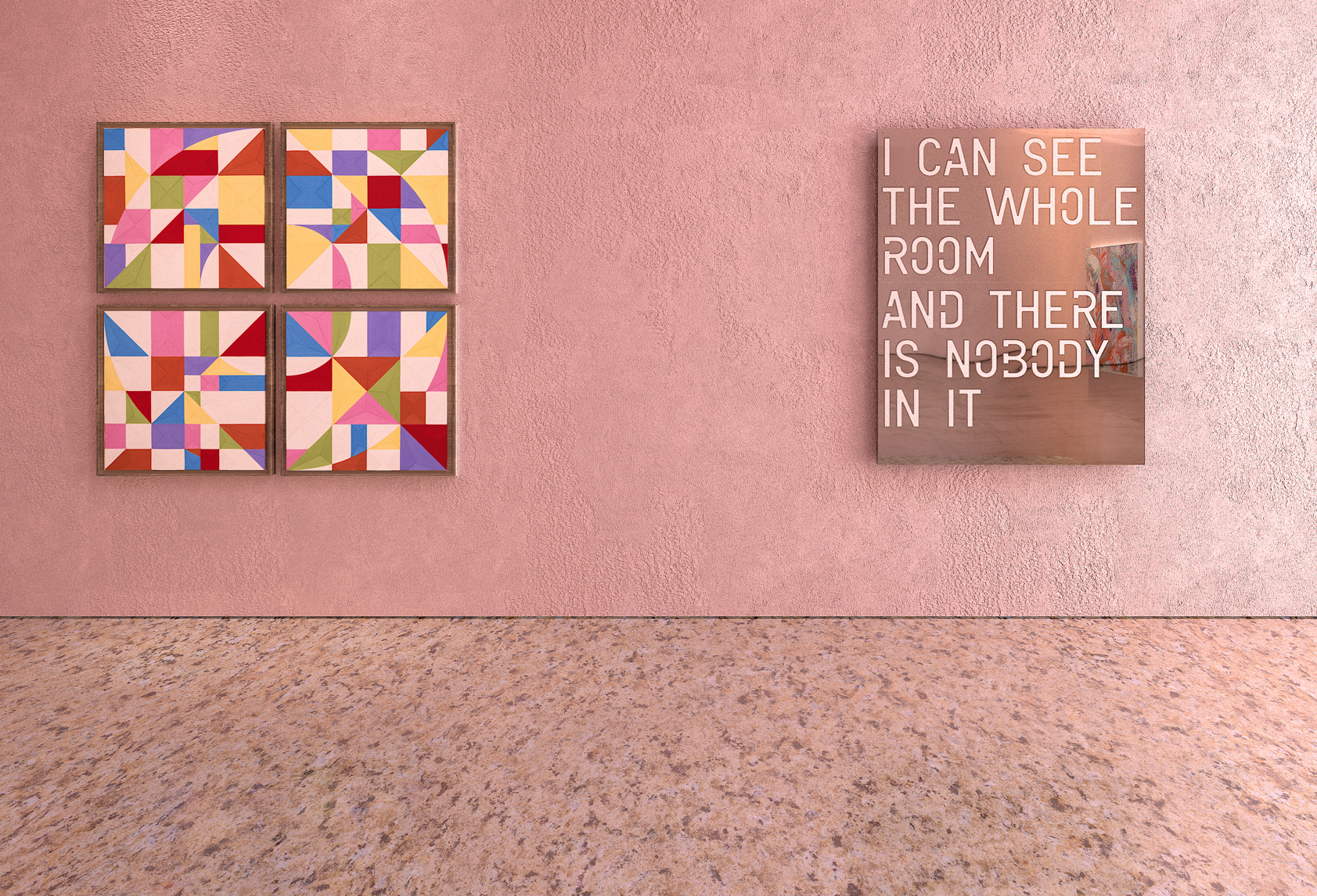 Transporting visitors to places one can only dream of at the moment, each exhibition space is housed within striking, fictional corners of the world. First stop, stepping outside, in an open-air gallery of concrete walls suggestive of Japanese master Tadao Ando’s architecture, aSubject sculpture by Sir. Antony Gormley and a geometric painting by José Dávila meets an interactive mirror sculpture by Jeppe Hein, reflecting the surrounding Mediterranean environment and furniture design by David Lopez Quincoces.