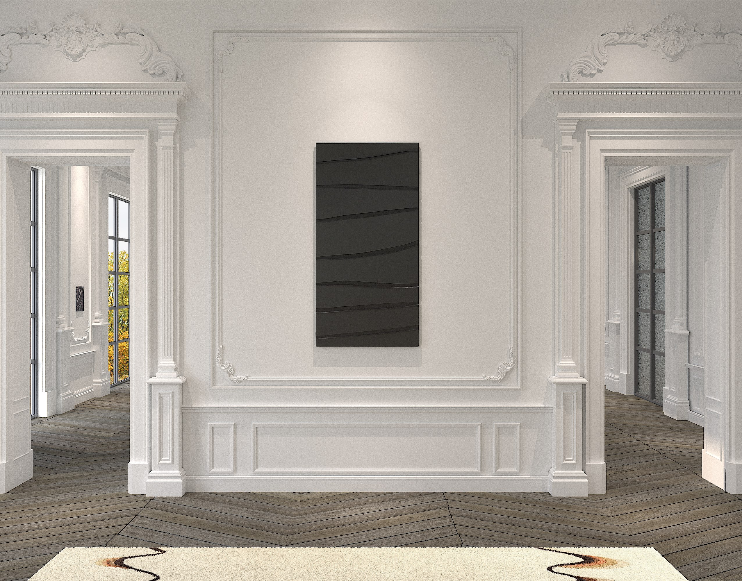 In the sophisticated backdrop of a Parisian apartment, influenced by the seascapes and sunset hues of Southern California, a translucent sculpture by DeWain Valentine meets the black opacity of an iconic Outrenoir by Pierre Soulages and a small-scale gem by the eminent post-war German artist Gerhard Richter. Blurring the dichotomies between abstraction and figuration, a painting by emerging star Aks Misyuta, reminiscent of Picasso’s Large Bathers, engages in an easy symbiosis with a painting by Harold Ancart, structured like a musical partition. The carefully curated collection in this room is completed with a large-scale abstract photograph by Berlin-based artist Thomas Ruff and a rare 1980s historical painting by Georg Baselitz.