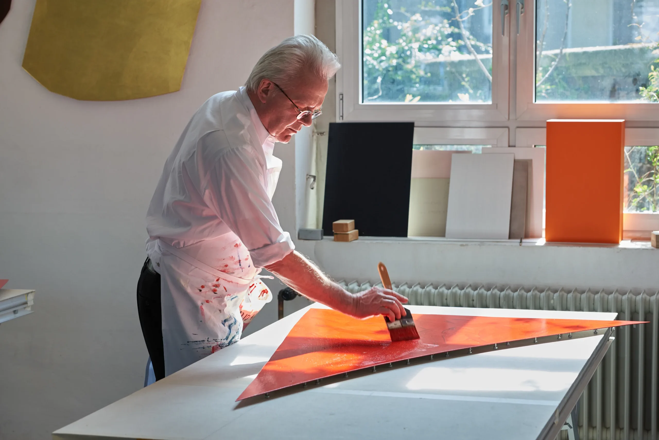 Imi Knoebel (b. 1940, Dessau, Germany) works with painted panels, modular forms, and industrial materials to explore the relationship between colour, shape, and spatial arrangement. His practice draws on Constructivist and Minimalist principles, often using repetition and variation to test how simple geometric elements can generate complex visual structures.