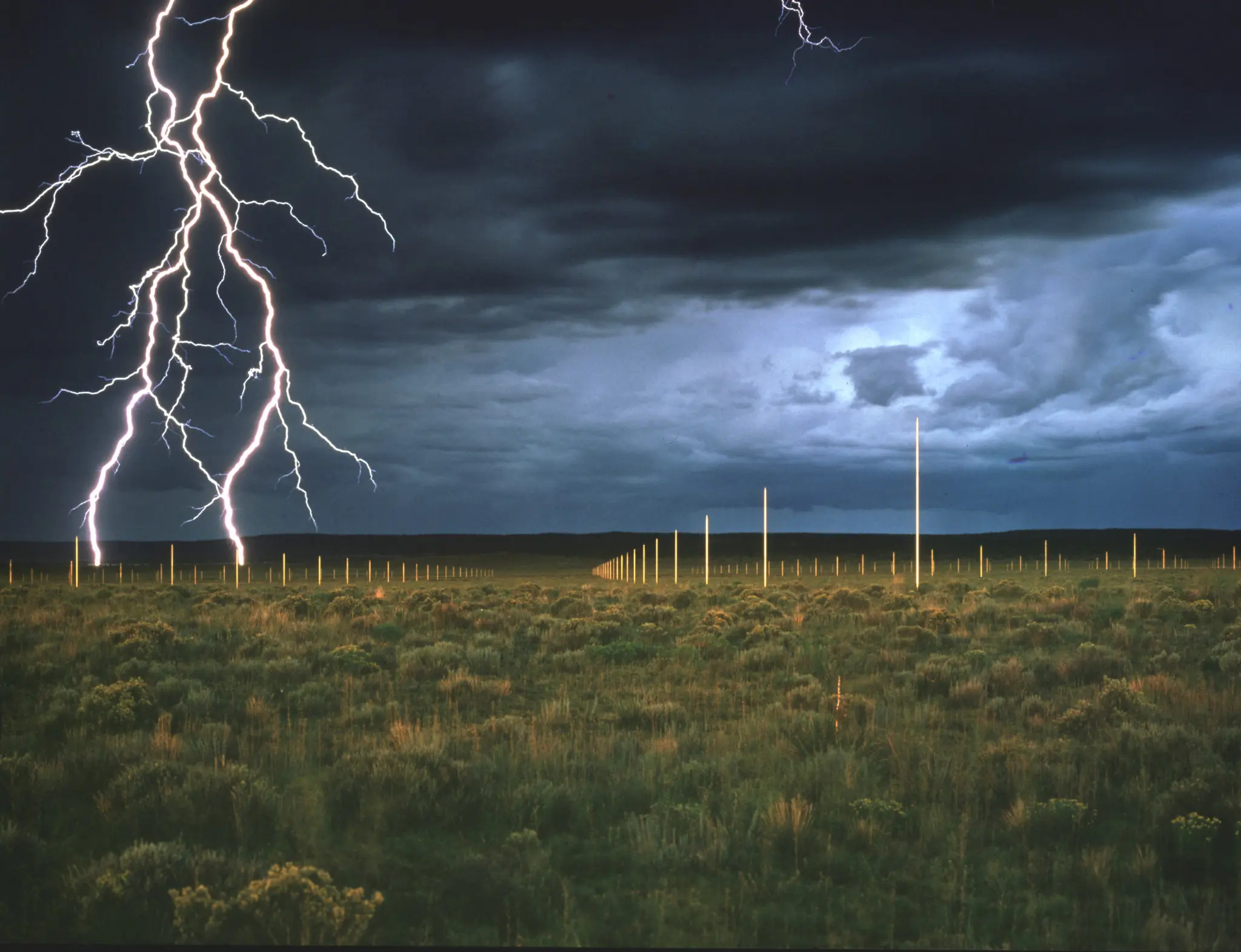 Walter De Maria (b. 1935, Albany, California – d. 2013, Los Angeles, California, United States) expanded Minimalist principles into large-scale, site-specific works. His practice combines geometric organisation with natural forces, most notably in The Lightning Field (1977), which uses a grid of metal poles to register weather and duration.