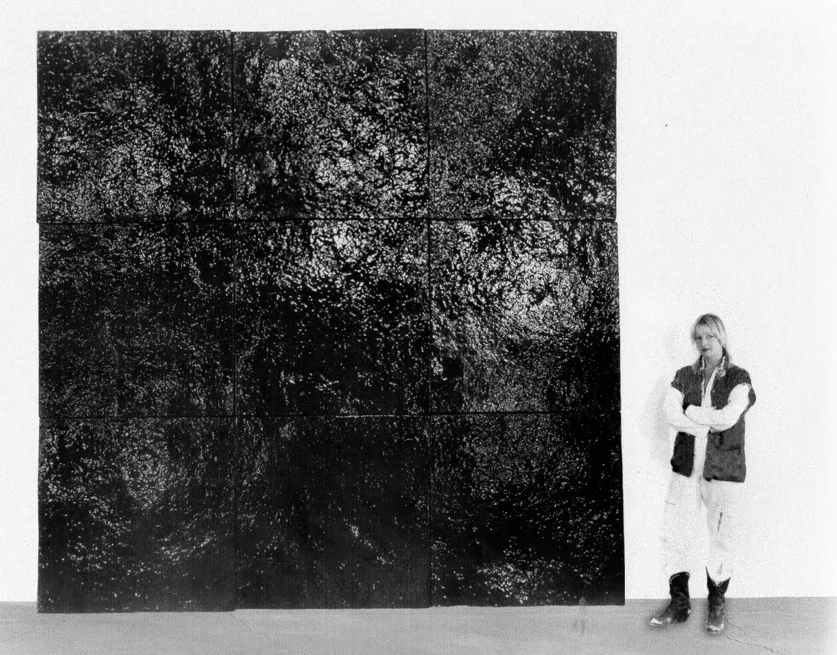 Mary Corse (b. Berkeley, California, United States) works with glass microspheres, acrylic, and reflective materials to create monochrome paintings that shift with changing light. Her practice emphasises perception and the viewer’s movement, aligning with the light-based experiments of the Los Angeles art scene.