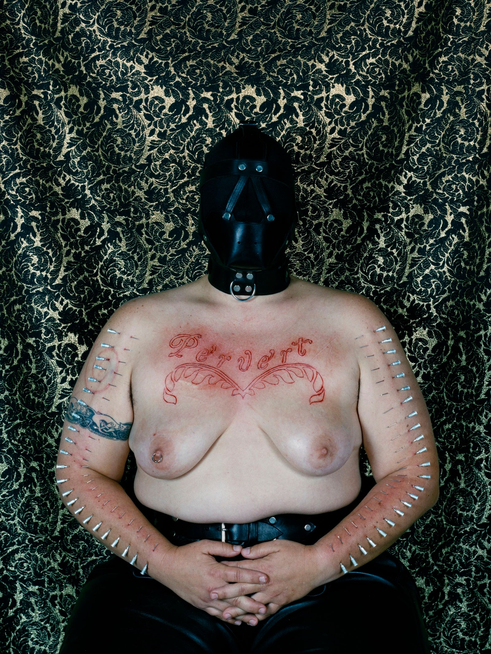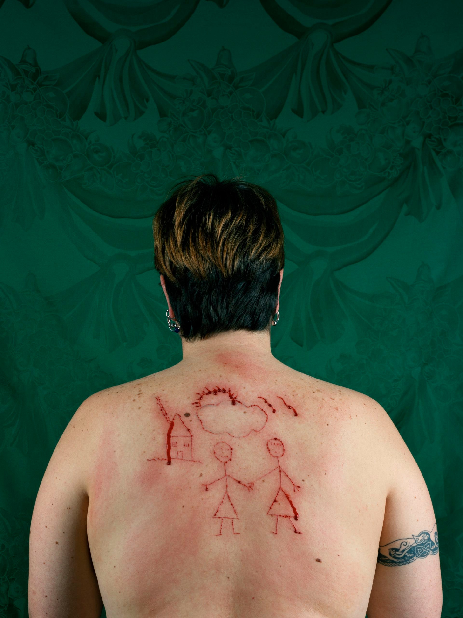 But her most famous photographs are probably two that she took of herself, early in her working life. In “Self-Portrait/Cutting,” which Opie made in 1993, when she was thirty-two years old, she stands shirtless with her back to the camera in front of an emerald-green tapestry, which offsets her pale skin and the rivulets of blood emerging from an image carved into her back with a scalpel: a childlike scene of a house, a cloud, and a pair of smiling, skirt-wearing stick figures. In “Self-Portrait/Pervert,” made the following year, Opie is faceless and topless and bleeding again: she sits in front of a black-and-gold brocade with her hands folded in her lap, her head sealed in an ominous black leather hood, the word “pervert” carved in oozing, ornate letters across her chest.