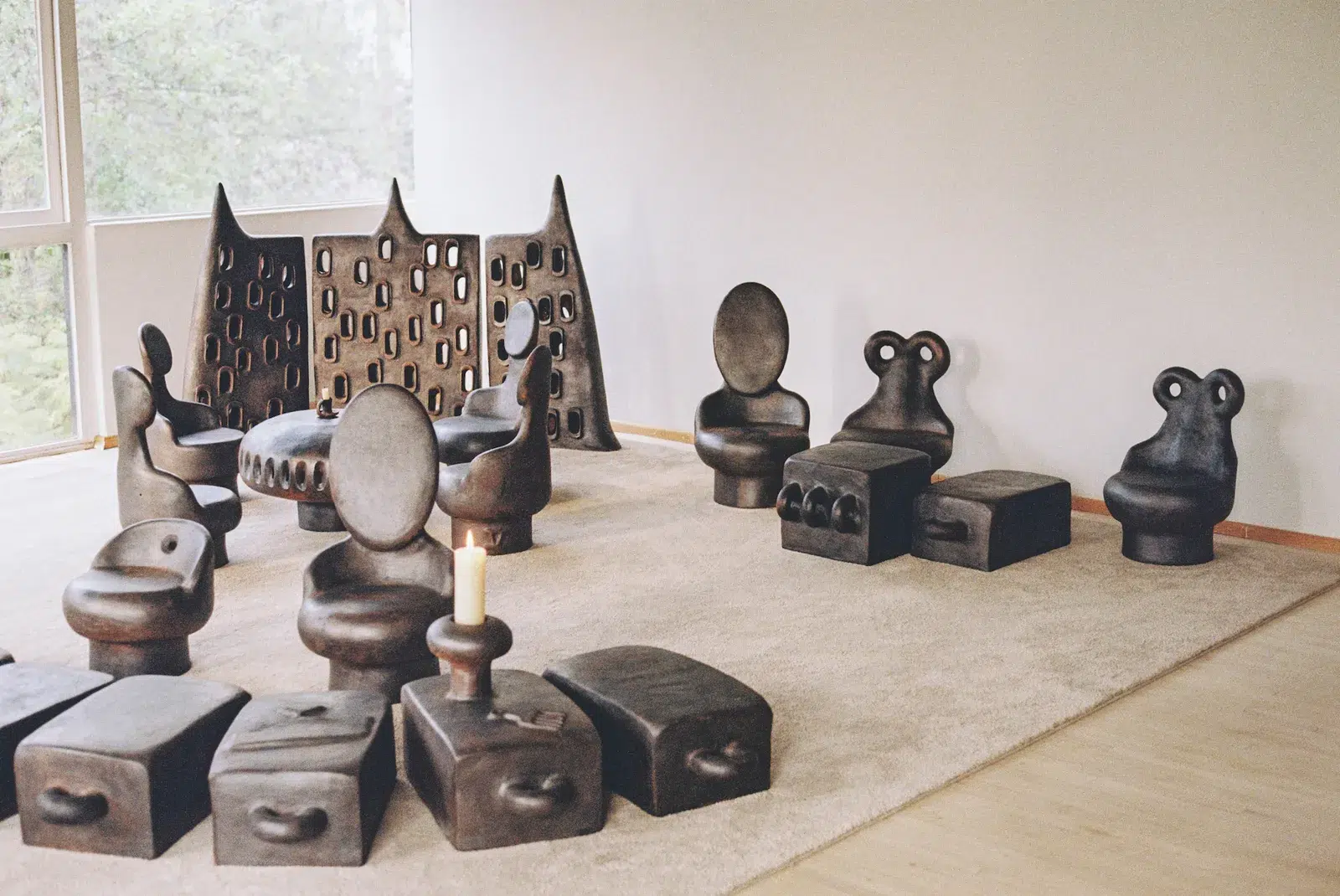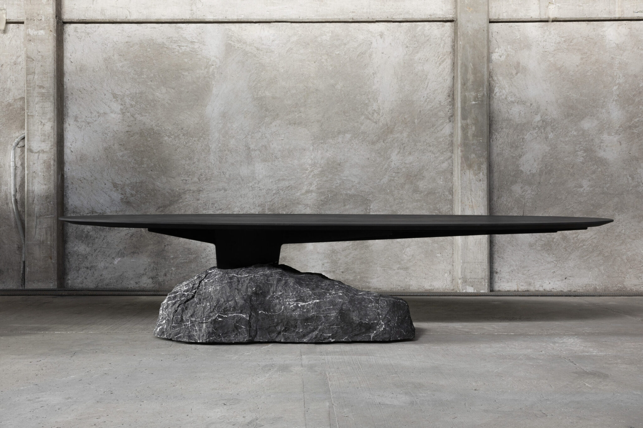 Originally from Barcelona, Pol Agustí is a designer based in Mexico City whose practice centres on black ceramic furniture and objects produced in the Mexican countryside. He is represented by Ago Projects. Twelve years ago, Agustí moved to Mexico after working across diverse fields including industrial design, art direction, production design, and photography, a multidisciplinary background that continues to inform his design approach. Working closely with local artisans, Agustí develops each collection through extended periods of shared living and making, using only three tools throughout the entire production process. This highly constrained methodology results in tables, chairs, lamps, and sound objects that have similar voluptuous forms and smooth cold surface texture. The pieces are characterised by black finishes and monolithic shapes that recall incinerated totems. As Agustí has remarked about his designs: “They’re like an excavation on Mars.”