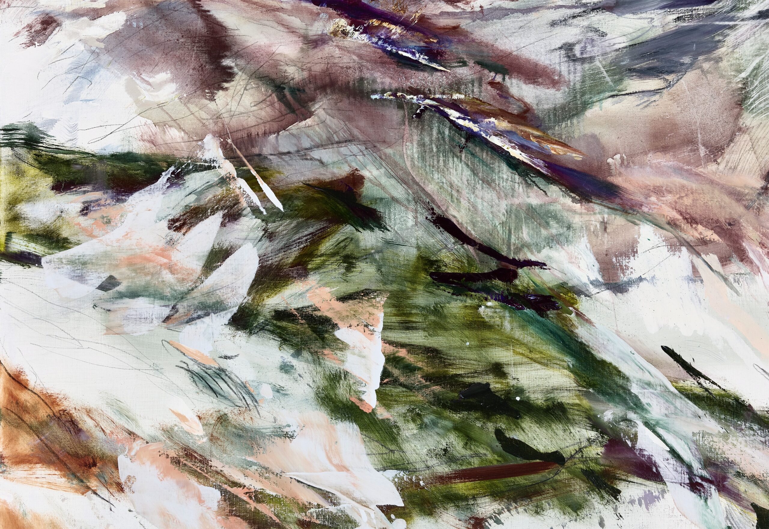 There’s also a real focus on balance and pacing. Chaos and restraint coexist in the wild, and are juxtaposed in my paintings. If the drawing is frenetic, the composition may be peaceful; if the surface is turbulent, colour might steady it. Growing up in hunting and commercial fishing communities taught me how to navigate with what you had at hand. I want viewers to navigate the paintings more like trackers—following traces rather than details.
