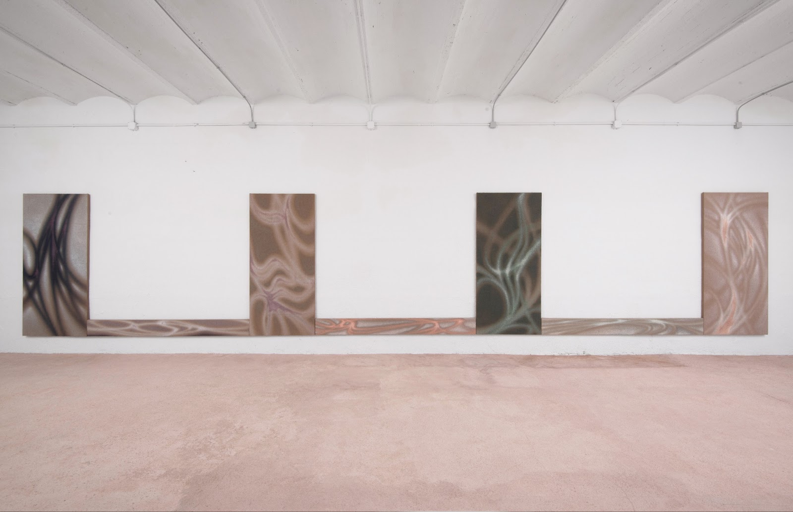 I work in a lot of different ways in the studio. Recently I have been producing hundreds of small airbrush works on paper. I find them really useful to work out certain compositions or movements. This process is very integral to the development of the mark making within the paintings. I then take these works on paper and start cropping, zooming and collaging them together psychically & digitally.