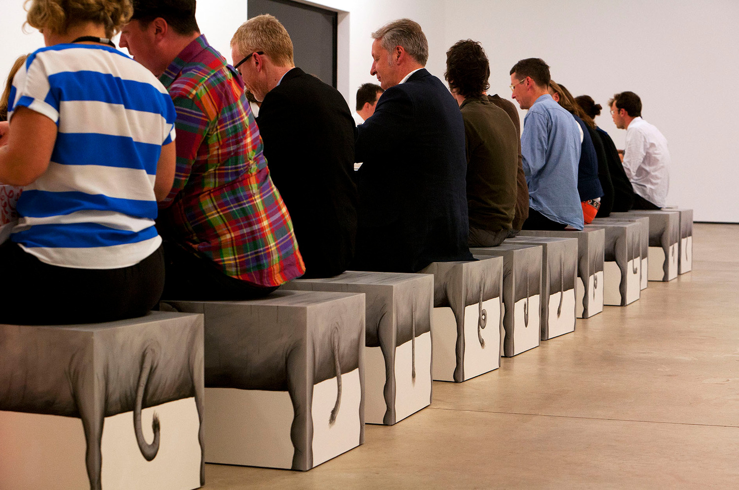 Party is the champion of pastels yet doesn’t limit himself by medium. Since his art school days, Party has courted many mediums, including sculpture, installations, painting and performance art. In 2011, he received his first major attention with a performative event he staged at Glasgow’s Modern Institute. For Dinner for 24 Elephants, 2011, Party invited two dozen guests, an eclectic mix of art world professionals, to a dinner party at a gallery for which he designed every piece, including the plates, the furniture, and the food. He and the gallery directors acted as waiters and served the guests for a four-hour meal. Most notably, the guests were sat on stools painted to appear as if they were riding elephants.
