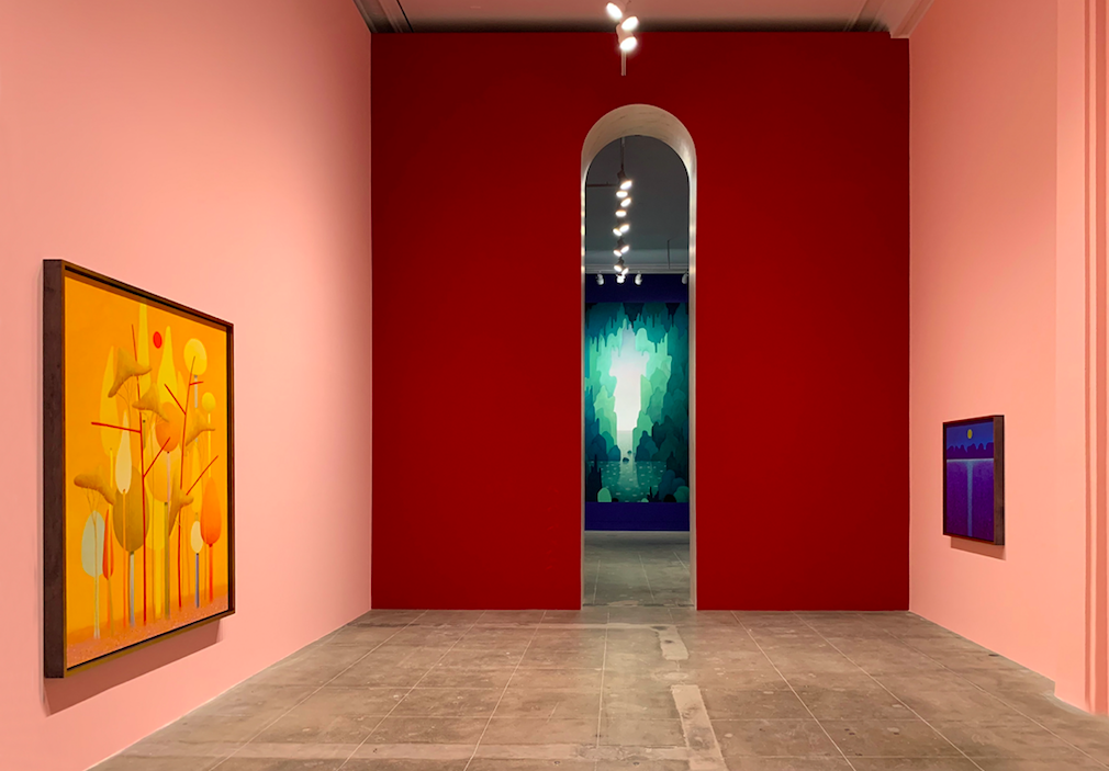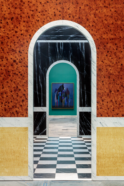 When at a Party exhibition there is always more to see than the works themselves. Party’s “architectural interventions” are part of his curatorial magic and create a comprehensive detachment from reality to surround the otherworldly content of the works. His most recent exhibition at Hauser & Wirth in Los Angeles, his first solo exhibition with the gallery and a show that launched with the second edition of Frieze LA, is a firm example of this magic. The walls of each room were completely saturated with red, blue, teal, and pink, separated by de Chirico-esque narrow rounded archways. Moving through the narrow space from one room to the other created an experience of traveling through worlds. Upon entering the gallery, the viewer is immediately confronted with options of these archways, and immediately seized by the surreal disorientation of the space, this is no white cube. In the middle of the exhibition space stands the Sottobosco Chapel, 2019, a chapel-like structure that appears to be made of marbles and exotic wood, but is in fact wood panels masterfully painted in the Trompe l’oeil technique, a technique used in the Renaissance to create realistic optical illusions of other materials, such as marble.