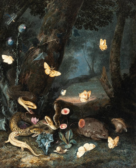 Inside Sottobosco Chapel, 2019, is Three Snakes, Lizard, and Toad, 1663 by Otto Marseus van Schrieck, the Dutch artist who made the sottobosco still life famous. Sottobosco means “undergrowth” or “underbrush”, and the sottobosco still life emerged with the scientific developments of the 17th-century Dutch Golden Age, when the invention of the microscope ignited a fascination with all things miniscule. Marseus directed the viewers gaze away from the domestic scenes of art at the time, and downward, toward the dense universe of a forest floor, teeming with life. The microscope allowed detailed viewing of these minuscule flora and fauna and rendering their depictions enlarged, alive and relatable. The inclusion of works my Marseus clues us into Party’s influence and makes his contemporality of the concept even more striking. This historical context reignites the revelation of seeing these tiny life forms as a rare and wonderous event.
