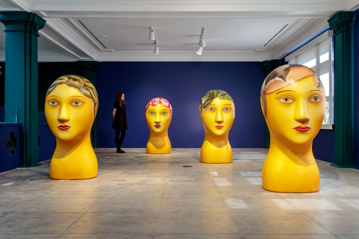 The first and last rooms of the main gallery hold portraits, on walls of deep sapphire. Party’s portrait subjects are stoic and glamourous. Their faces are poised, and their hair pristinely coiffed in smooth updos. They are fantastically dressed, in elements of nature. In Portrait with Roses, 2019 a woman is gowned in blooming pink roses. In Portrait with Mushrooms, 2019 large assembled mushrooms conceal a woman’s teal skin from the chest down. Portrait with Snakes, 2019 show a proud woman facing the viewer head on with a snake coiled loosely around her, draped as if a shawl, and a singular moth adorning her hair. Two giant frogs shape the coat of a man in Portrait with Frogs, 2019 with a lone butterfly fluttering near his blue skinned face and unbothered expression. The viewer moves through an archway and the walls of the middle room are painted in cameo pink. This room holds Landscape, 2019 an assemblage of tall skinny trees, with trunks of blues, reds, and orange with bushy canopies of canary yellow. Across from Landscape, 2019 is Sunset, 2019 a moody depiction of a yellow sun lowering towards a lagoon-esque sea of deep greens and teals. This work is complementary to Sunset, 2020 which depicts a robin egg blue sun setting over a liquid gold sea with shades of deep red and orange.
