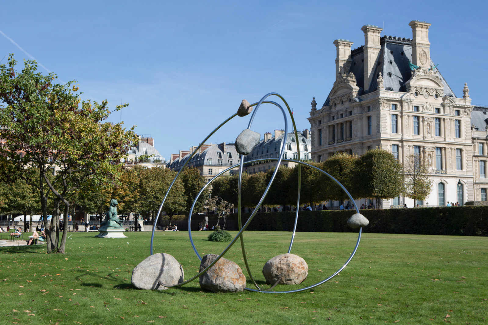 In Revolution Orbiter, Kwade builds on ideas explored in her ParaPivot series, but instead of placing stones along rigid, linear frameworks, she sets them within sweeping circular formations. This shift from straight lines to orbits amplifies her investigation into gravity and motion, pushing the limits of what can be physically balanced and held in place. The work becomes a finely tuned negotiation between opposing forces, a fragile equilibrium. The German title Drehheitsgrad, meaning “degree of freedom,” refers to the range of movement an object possesses, though here the stones are tightly constrained. They rely on absolute precision to remain suspended, even as their configuration creates the illusion of dynamic, continuous rotation. Kwade invites viewers to feel this tension and reflect on the idea of freedom itself—particularly the way our own movement through the cosmos is fixed, our orbit predetermined long before we are born. For Kwade, gravity is both the essential force that anchors existence and a paradoxically weak one, easily countered by the human hand. Circularity, orbital patterns, and the suggestion of motion recur throughout her sculptures, reminding us of the unseen forces and predetermined trajectories that silently structure our lives.