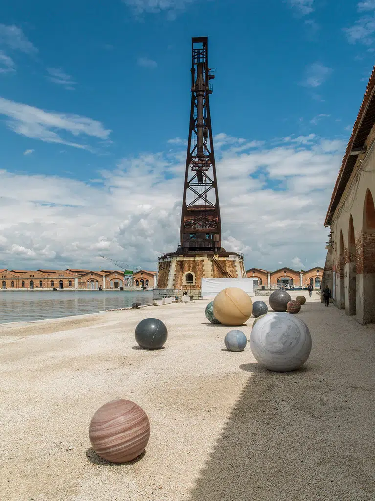 A recurring motif in Kwade’s work is the circling system or the idea of forms repeating into infinity, which is echoed here in the sphere appearing in various sizes. As she has explained in an interview, she continually returns to this imagery because the matters she is dealing with are “time, space, gravity, and that automatically brings you into a circulation.” Kwade strives to keep her works open-ended, encouraging viewers to engage their imagination and derive a range of interpretations. In an interview, she noted that when looking at Pars Pro Toto, she envisions God playing marbles, and she hopes the work prompts people to question the randomness of human existence. One work from this series was shown in the Arsenale at the 2017 Venice Biennale. It featured twelve meticulously selected stone spheres arranged like a family of planets momentarily frozen in orbit. In this iteration of the series, Kwade also incorporated an audio recording from the Voyager Golden Record, produced in 1977. The soundtrack, intended for extraterrestrial civilizations and future humans, was designed to communicate the richness and diversity of life and culture on Earth, adding a further conceptual bridge between the physical presence of the stone spheres and the broader narrative of human curiosity, communication, and our desire to situate ourselves within the cosmos.