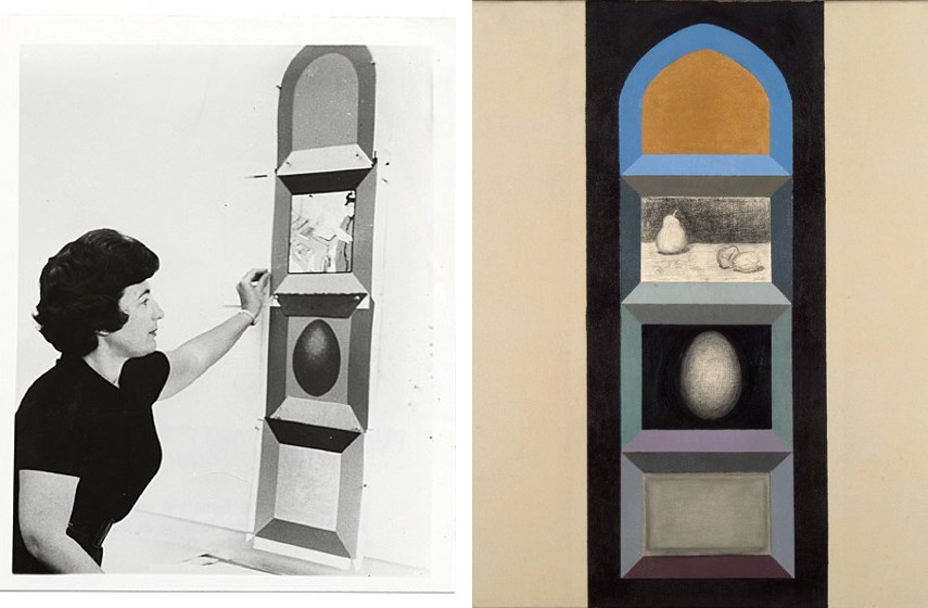 As Noland, Schapiro started her career by creating paintings that drew from the tradition of Abstract Expressionism, producing works that were hypnotic, mystical and revealed her mastery of colour and technique. However, at the beginning of the 1960s, she began to eliminate the brushwork and introduce a variety of geometric forms. Between 1961 and 1963, she created a body of work called the Shrines, a quasi-Surrealist, geometric compositions which contained figurative references to femininity and art history. Although being quite innovative and gravitating towards the new trends, these works did not fit in any of the movements that were going on at the time.