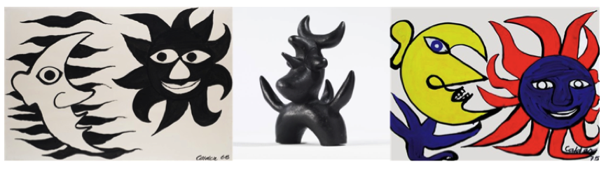 Constellations shows that in addition to similar creative sensibilities, the two men shared much more in common. On one hand, they both recurred to the usage of interlacing, uninterrupted lines to create shapes and creatures and of a naughty, childlike playfulness. On the other, they reflect their own very distinguished personalities: Calder being more light-hearted, naïve and cheerful; while Miró wanted to frighten the viewer through his innocent looking shapes, illustrating the dark side of humanity through distortion and fragmentation.