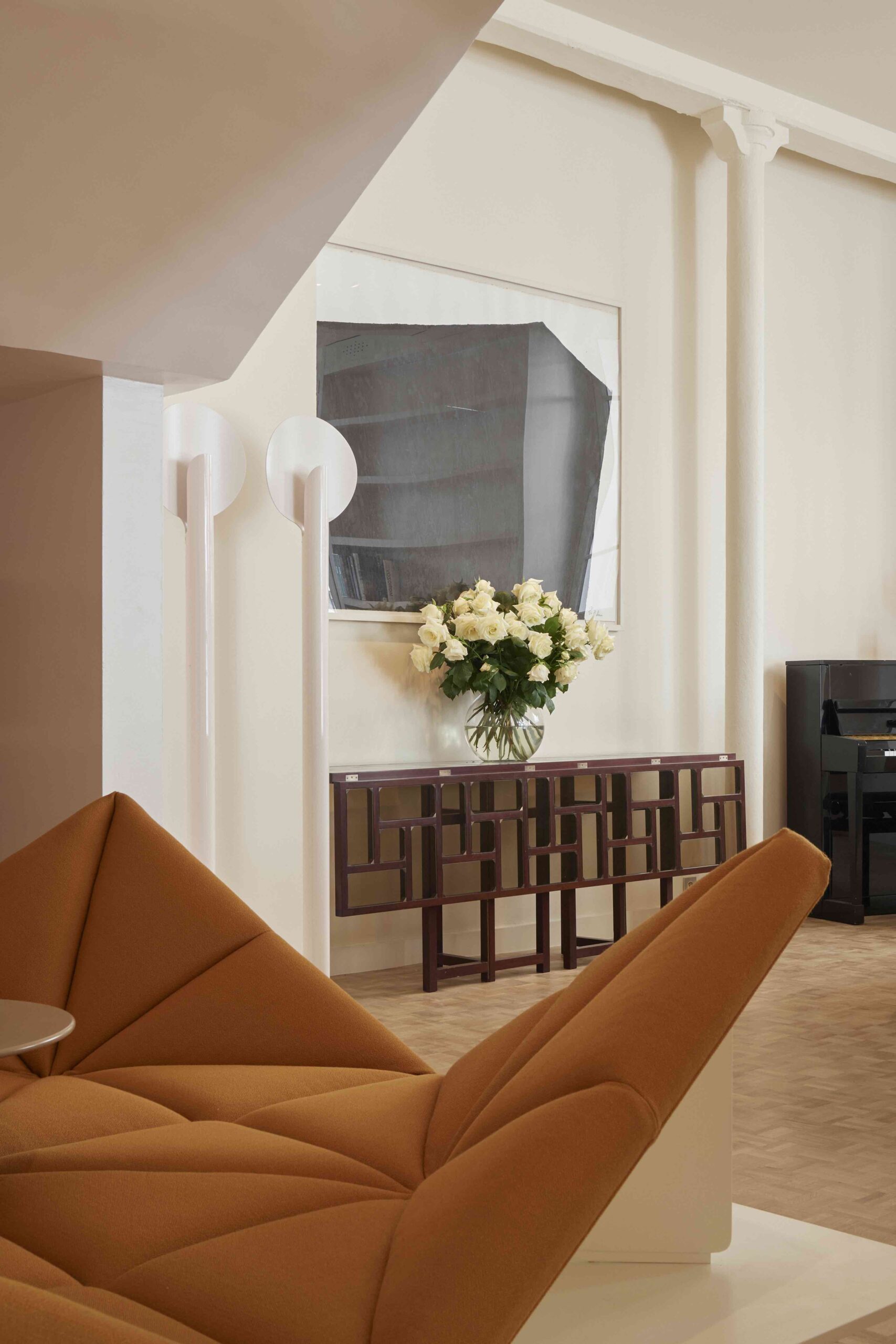 The origami-like form of the ‘Tapis-Siège’ daybed, with its corners that can be propped up to recline against is the perfect sofa to relax or to read, as this piece functions both as sofa and as storage for books and magazines. ‘Our absolute favourite thing to do in the living room is to all climb onto that piece and read,’ says Paulin’s son Benjamin.