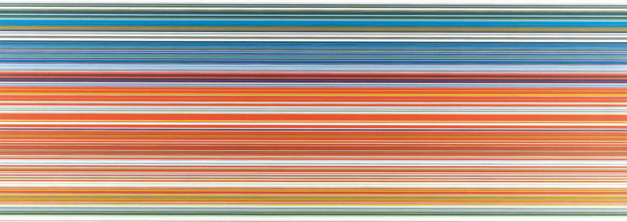 In 2011, Richter once again reinvented his artistic process with his Strip series. Stepping away from the use of source material taken by others, he instead utilized his own earlier painting as the source material. Digitally dissecting his Abstraktes Bild (724-4) (1990) into 4,096 sections, Richter mirrors, multiplies and recombines the details, finally printing them as pictures composed of horizontal stripes, in various formats up to 10 meters in length. Using computer-controlled image-making processes to reinterpret his own abstract painting, we are once again reminded of Richter’s incredible, chameleon-like ability to transform as an artist.