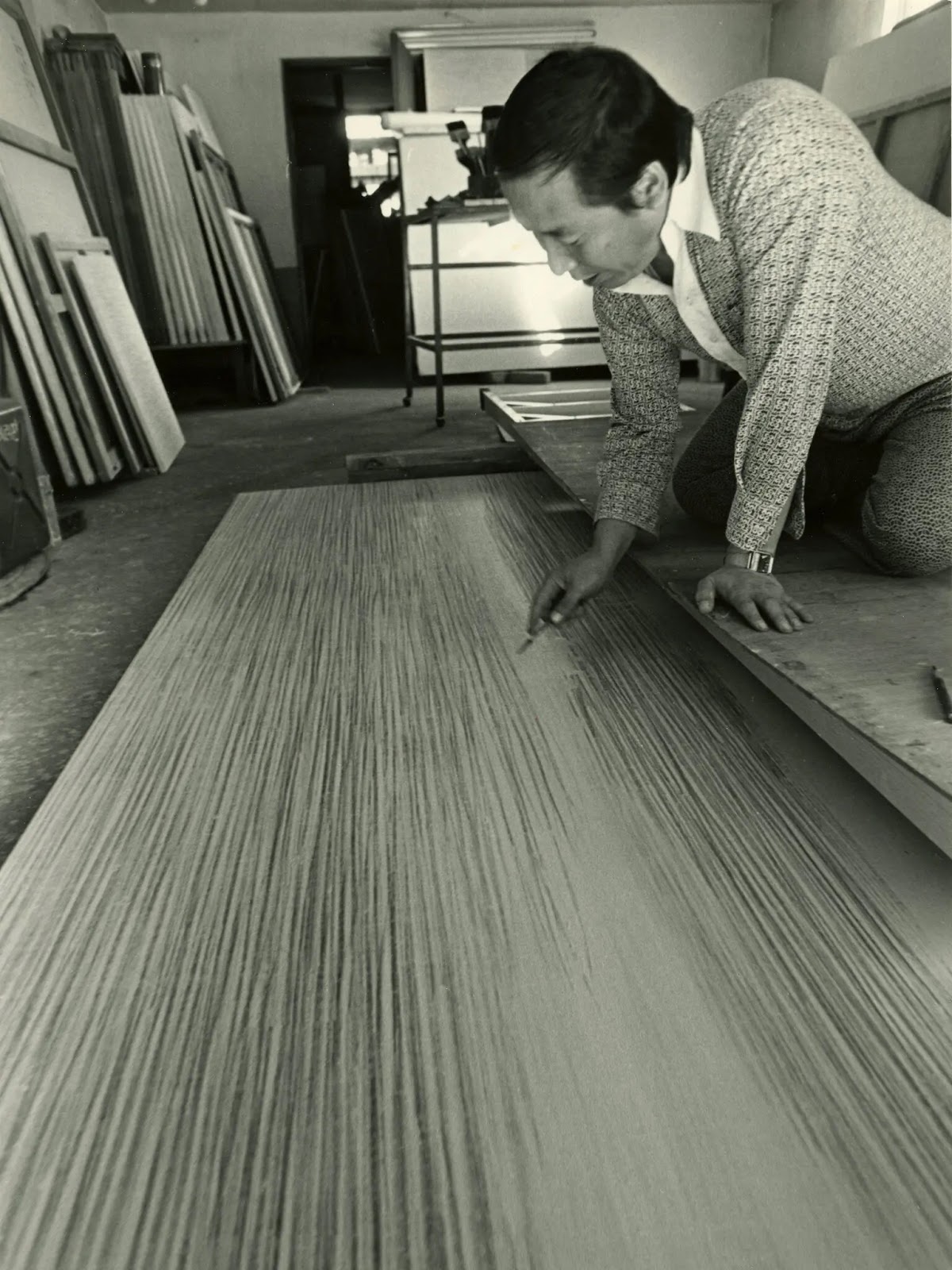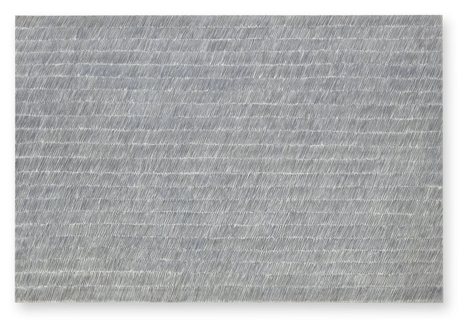 Known for his “Écriture” series, Park developed an unconventional new technique. This began in the early 1970s as ‘pencil-écriture’, inspired by his three-year-old son’s rudimentary penmanship. Witnessing his son’s frustration during a handwriting exercise, Park began to emulate his mark-making by drawing numerous delicate repetitive graphite lines on a canvas coated with gesso and wet, white paint. The gentle movement of Park’s ‘graphisme’ creates a vibrating effect in which the artist emphasised the meditative aspects of an art technique derived from endless repetition – to the point of “emptying oneself out”. “Écriture” is French for writing, though Park preferred the Korean “Myobop”, which translates as “method of describing”. In this process, Taoist and Buddhist philosophies underpin the spiritual journey intrinsic to this approach. Through repetitive action, Park was able to harness a flow of energy which focussed his restless creativity and mind on a path of self-discipline and self-improvement, akin to the scholar-monks of ancient Korean tradition.