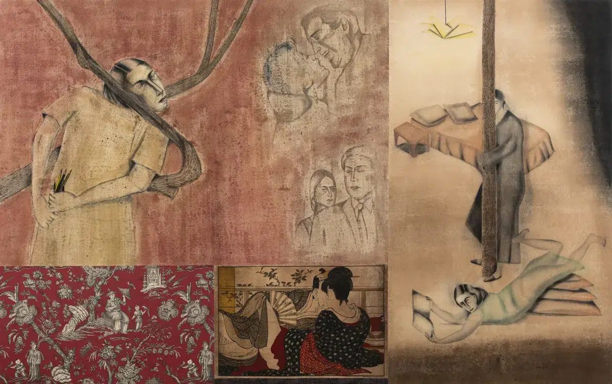 In Politics of Pause, Anju Dodiya transforms stillness into an act of quiet defiance. Working from her Ghatkopar studio, she layers fabrics, collages, and painted fragments into restless tableaux that mirror the fractures of our times, social, political, and personal. Figures twist, mourn, and reflect within divided surfaces, their gestures oscillating between tenderness and tension. Inspired by the spectral presence of trees and the myth of Daphne, Dodiya’s new works meditate on transformation, grief, and the fragile pursuit of joy amid chaos. Refusing spectacle, these paintings invite us to linger , to pause, in a world that demands constant motion.