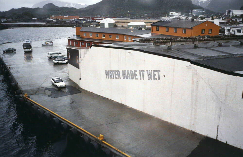 WATER MADE IT WET (1998) was created for the Lofoten International Art Festival in Svolvaer, Norway, an intriguing work installed on the facade of a building in the town’s harbour. The text, deceptively simple, reads just as the title: “WATER MADE IT WET.” Its tautological phrase highlights Weiner’s talent for distilling common observations into poetic and conceptual propositions. Placed in the coastal environment of Lofoten, the statement becomes both humorous and profound, drawing attention to water’s intrinsic qualities while anchoring the work in its literal and conceptual context.