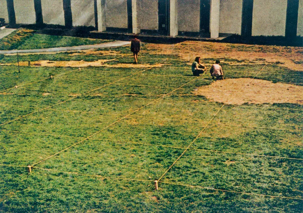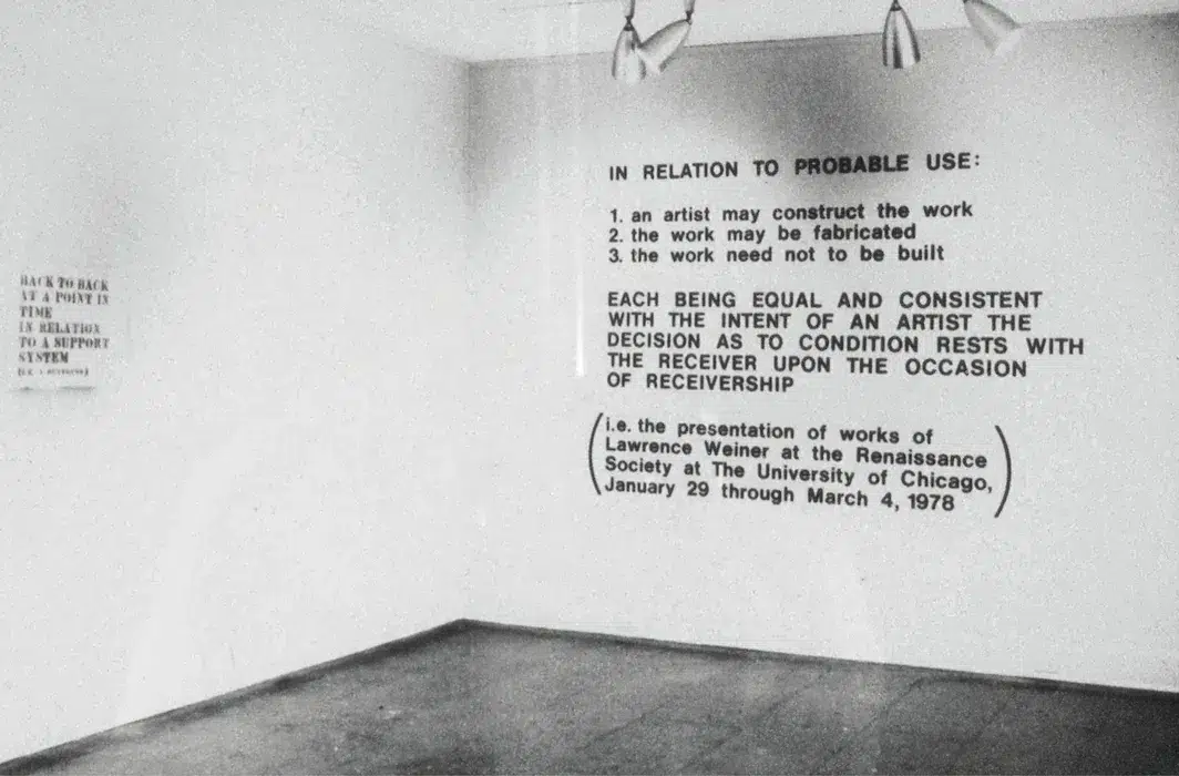 In 1968, Weiner reached a pivotal moment in his practice during an outdoor exhibition at Windham College in Vermont, organised by Seth Siegelaub. He created a sculptural installation marking a large rectangle on the campus lawn with wooden stakes and twine, within which a smaller section was designated as “removed,” a conceptual subtraction defined by absence. Before the exhibition concluded, students cut through the twine to take a shortcut across the lawn. Confronted with the disappearance of the physical work, Weiner realised its essence remained intact when expressed in words, leading him to regard the idea as equal to its material realisation and to shift toward language as his primary medium.