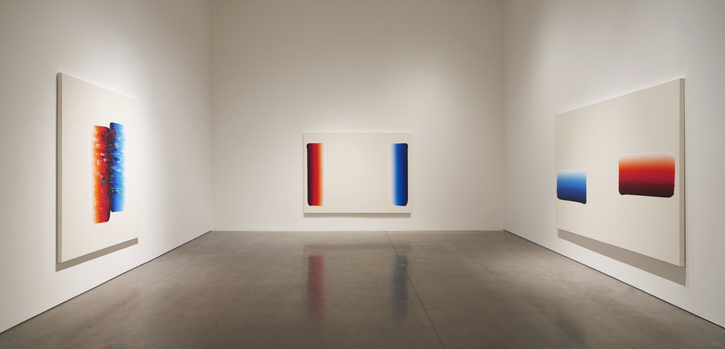 Each painting is created in a highly controlled manner with brushstrokes that relate to the artist’s breath. Each work may take a month or more to complete, focusing on the resonance of space, colour, light, and tension. These paintings introduce gestural strokes as well as unaltered expressionistic elements, including dots and specks of paint. These forms invite communication from the viewer, completing the concept of a dialogue, this series’ name.